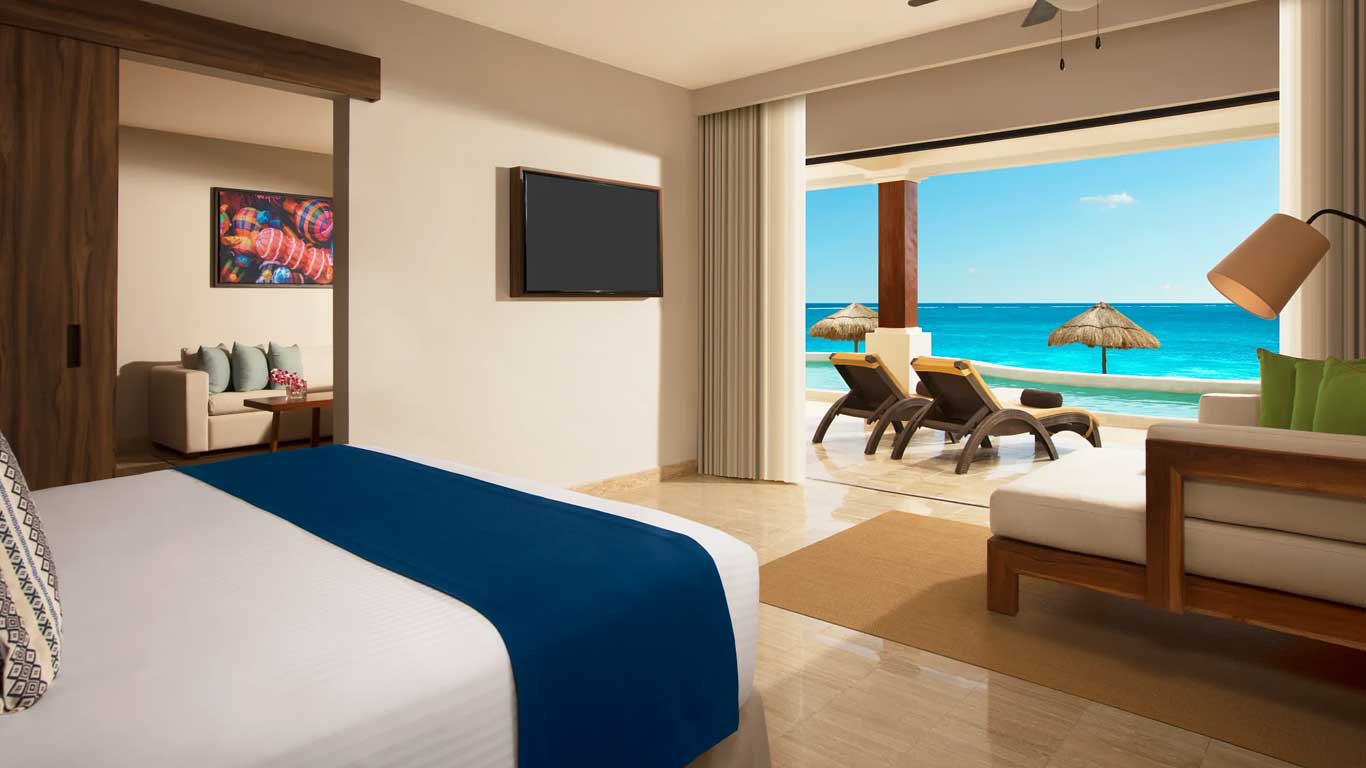 The Preferred Club Junior Suite Ocean View at Dreams Playa Mujeres Golf & Spa Resort offers 624 sq. ft. of comfort with your choice of one king-size bed or two queen-size beds. The suite features a separate living area with a sofa bed, a bathroom with a rain shower, water closet, and double vanities, plus a furnished private terrace with a hot tub. Guests also enjoy exclusive Preferred Club amenities. The king suite accommodates up to 4 guests (with a maximum of 3 adults), while the queen suite accommodates up to 5 guests (also with a maximum of 3 adults).